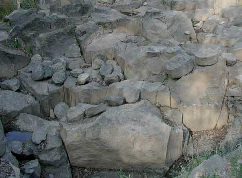 Zahlreiche in diesem Bruch gefundene beschädigte Rohlinge und Bruch- stücke von römischen Handmühlen zeigten, dass überwiegend Mahl- steine und wenig Bausteine produziert wurden. Getreidereiben gehörten nicht mehr zur Produktpalette. - Leider sind weitere römische und vorrömische Arbeitsspuren im Gebiet des Mayener Grubenfeldes dem mo- dernen Basaltabbau der Neuzeit zum Opfer gefallen. |