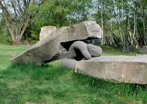 Seit Beginn der achtziger Jahre des 20. Jhdt. findet in regelmäßigen Abständen auf dem Gelände des stillgelegten Mayener Grubenfeldes ein LAPIDEA genanntes Naturstein - Symposium statt. Steinbildhauer aus aller Welt treffen sich an den alten Steinbrüchen, um aus dem spröden Basaltgestein, aber auch aus anderen Materialien der Vulkaneifel Kunstobjekte zu schaffen. Als Beispiel soll hier ein Werk des japanischen Bildhauers Yusuke Toda vorgestellt werden: |