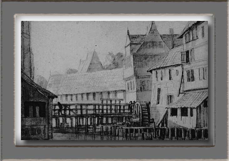 (Pumpanlage für Trinkwasser) zu sehen, dessen Wasserrad für den Antrieb des Schöpfmechanismus sich in dem mit einem Pultdach gedecktem Anbau befindet. Wasserkunst und Wassermühle ist eine häufig anzutreffende technische