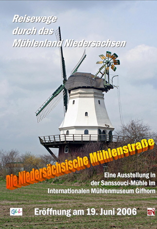 Unter dem Titel “Reisewege durch das Mühlenland Niedersachsen” eröffnet Niedersachsens Landwirtschaftsminister Hans-Heinrich Ehlen am 19. Juni 2006 im Internationalen Mühlenmuseum Gifhorn eine Ausstellung zur Niedersächsischen Mühlenstraße (NMS). In einer Gemeinschaftsaktion zwischen dem Niedersächsischen Ministerium für den ländlichen Raum, Ernährung, Landwirtschaft und Verbraucherschutz, der Behörde für Geoinformation, Landentwicklung und Liegenschaften (GLL) Otterndorf und der Arbeitsgruppe Mühlenstraße i.d. Mühlenvereinigung Niedersachsen - Bremen e.V. sowie dem Internationalen Mühlenmuseum Gifhorn wurde ein Ausstellungskonzept erarbeitet, das in der Sanssouci-Mühle auf dem Gelände des Gifhorner Mühlenmuseums den derzeitigen Stand der geplanten landesweiten Vernetzung des Projektes “Niedersächsische Mühlenstraße” präsentiert. Auf 13 Lichttafeln und Stellwänden werden die Standorte von 256 historischen Mühlen in 17 Landkreisen entlang einer ca. 2.500 km langen Autowanderroute dargestellt und mit Themen zur niedersächsischen Mühlengeschichte erläutert. Ein Computerterminal zeigt in einer Bilderschau Impressionen aus der niedersächsischen Mühlenlandschaft und ein sog. “Kaiser-Panorama” - ein Projektionsgerät aus der Zeit um 1880 - zeigt Mühlenbilder in alter 3-D-Technik. Prospekte der einzelnen NMS-Bereiche und Buchempfeh- lungen vervollständigen das Ausstellungsangebot. Die Präsentation wird künftig in weiteren Abschnitten dem jeweiligen Entwicklungsstand der NMS angepasst und ergänzt.
