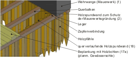 Konstruktion der Holzgründung unterhalb der Wehrwangen und im Tosbecken