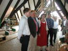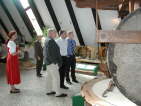 Um 9.30 Uhr begrüßten Rosita Wrobel und Philipp Oppermann von der Museumsleitung den Minister mit einem Schluck Gifhorner Mühlenkorn am Eingang des Mühlenmuseums und gaben ihm zunächst einen kleinen Überblick über die Entstehung und Entwicklung dieser weltweit einmaligen Anlage. Über 40 maßstabsgetreue Modelle von Mühlen aus aller Welt werden in der Ausstellungshalle gezeigt, ergänzt durch Utensilien aus den Bereichen Müllerei und Mühlenbau. Auf dem Freigelände des 1980 eröffneten Museums finden sich mittlerweile 15 Mühlen in Originalgröße, teilweise als translozierte Originalbauten, deren Erhalt am früheren Standort nicht möglich war, teilweise aber auch in originalgetreuen Rekonstruktionen nicht mehr existenter Mühlen. Den gastronomischen Mittelpunkt bildet der „Dorfplatz“ mit mehreren Fachwerkhäusern im Niedersachsen-Stil, der den Rundlingsdörfern im Hannoverschen Wendland nachempfunden wurde. In holzbefeuerten Steinbacköfen werden hier vor den Augen der Besucher Brot und Kuchen gebacken, die im Museum verzehrt, aber auch mit nach Hause genommen werden können. |