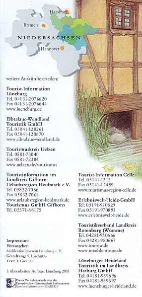 In 3. Auflage ist ein Faltprospekt im DIN A 2 - Format zu der erweiterten Niedersäch- sischen Mühlenstraße (NMS) erschienen. Die Route führt nunmehr über eine Strecken- länge von ca. 1.300 km durch die Landkreise Lüneburg, Lüchow-Dannenberg, Uelzen, Celle, Gifhorn, Soltau-Fallingbostel, Rotenburg (Wümme) und Harburg und verbindet insgesamt 128 Mühlenstandorte. Der Prospekt ist kostenlos und kann bei den Tourist- büros der Landkreise (s. oben) oder dem Mühlenförderverein Lüneburg e.V., Tel. Nr. 04131-20 82 24; Fax: 04131 - 20 82 10 bestellt werden.