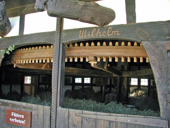 Ein Blick in den Pferdegöpel zeigt das aus Eichenkernholz gefertigte Göpelrad, das auf speichenförmig angeordneten Balken liegt, die an der in der Radachse senkrecht stehenden Spindel befestigt sind und über eine schirmartige Gestängekonstruktion an der Spindelspitze gehalten werden. |