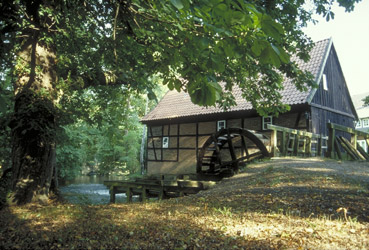 Wassermühle Holxen Hohe Kastanien beschatten den Holxer Mühlenhof, dessen Innenhof ein Wohnhaus von 1816 und ein kleines, verbrettertes Mühlengebäude von 1825 begrenzen, während ein Backhaus aus dem 19. Jh. etwas zurück liegt. Eine Feldsteinbrücke mit einer danebenliegenden Furt überquert die Hardau gleich unterhalb der Mühle, während sich Besucher von der Kopfsteinpflasterstraße, die am Rand des Hardautales nach Suderburg führt, der Mühle nähern. Nach wenigen Schritten steht man hier vor dem mächtigen, unterschlächtigen Wasserrad, unter dem der Stahlbach in die Hardau mündet, sodaß die Mühle gewissermaßen an “zwei rauschenden“ Bächen liegt. 1321 ist diese Mühle erstmals erwähnt, die als Korn-, Grütz-, und Bakemühle genutzt wurde. Wohl bis in die 1920er Jahre hinein hatte sie zwei Mühlenräder, und bis 1950 arbeitete die Mühle nur mit Wasserkraft. Dann stellte der Müller den Betrieb ein. Die Mühleneinrichtung blieb erhalten, doch verfiel in der Folgezeit das Wasserrad. 1983 renovierte der Besitzer die Mühle, sie erhielt ein neues Wasserrad und kann zu Mahlvorführungen wieder in Betrieb genommen werden. |