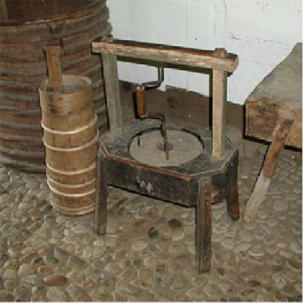 Handmühle zum Zermahlen von Senfkörnern - ausgestellt im Flett des Brümmerhofes.