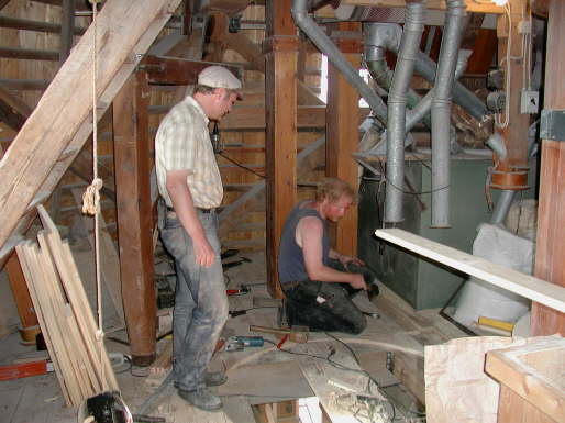 Die Aktion "Windgängiger Steinmahlgang für Backschrot" in der Bardowicker Windmühle war von langer Hand vorbereitet. Mühlenbesitzer Eckhard Meyer (lks.) hatte bereits vor zehn Jahren während seiner Ausbildung an der Deutschen Müllerschule Braunschweig die Vision, in der Windmühle, die er nach der Meisterprüfung von seinem Vater übernehmen würde, windgemah- lenes Mehl für Nahrungsmittel herzustellen und zu vermarkten. In der Mühle war ein Steinmahlgang vorhanden, der jedoch der Produktion von Futtermitteln vorbehalten blieb. Um seine Absicht realisieren zu können, ergab sich somit die Notwendigkeit, einen zusätzlichen Steinmahlgang einzurichten. Schon früh bemühte sich Eckhard Meyer, die Kosten dieses Projektes durch den Ankauf gebrauchter Geräte und Bauteile z.B. aus stillgelegten Mühlen so gering wie möglich zu halten. Als Anfang der Neunziger die Motormühle von Hermann Petersen aus Marschacht ihren Betrieb einstellte, konnte er aus deren Inventar eine Steinbütte mit Rumpfzeug, Steingalgen und Mühleisen mit Spurbock und Spurzapfenlager günstig erwerben. Vom Wassermüller Wilcke aus Staats bei Stendal besorgte er sich ein passendes Steinpaar aus Süßwasserquarz (Franzosen) und über Uwe Karstens kam er an einen Fliehkraftregulator aus der abgebrannten Flotbecker Windmühle. Karl Rohlfing (re.), versierter und bekannter Mühlenbauer aus Stemwede an der Westfälischen Mühlenstraße, erhielt nun den Auftrag, die vorhandenen Teile mit neuen zu einem funktionierenden Steinmahlgang zusammenzufügen, der sowohl durch Windkraft, wie durch einen E-Motor angetrieben werden kann. Nachdem die Finanzierung des Vorhabens gesichert war, konnte Anfang August dieses Jahres auf dem Kleieboden der Bardowicker Windmühle - der Steinboden ist mit Schrotgang, zwei Walzenstühlen, Haferquetsche und zwei Mischmaschinen bereits “überfüllt” - begonnen werden.