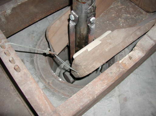 Ein “Augen-Blick” (ins Auge des Läufersteins) offenbart die Wirkungsweise des Rüttelschuhes. Die unter dem Trichter in geneigter Position hängende Vorrichtung wird bei Drehung der Spindel durch Anschlagen der vier an der Mahlspindel angeschraubten Rundeisenstäbe (“Vierschlag”) am Schlagholz des Rüttelschuhes in eine rythmische Bewegung gebracht, deren Frequenz sich mit der Drehzahl ändert. Somit wird der Mahlgang bei schnelleren Umdrehungen stärker gespeist und bei langsameren entsprechend geringer. Zur Feindosierung dient das vorn am Rüttelschuh befestigte Seil, das durch Spannen oder Lockern über eine arretierbare Seilwelle ein Heben oder Senken des Rüttelschuhes und damit eine Änderung der Zutrittsmenge bis zur vollen Unterbrechung oder Öffnung des Einlaufes bewirkt und durch Schrägzug um die Holznägel den Anpressdruck des Schlagholzes an den Vierschlag steuert. -