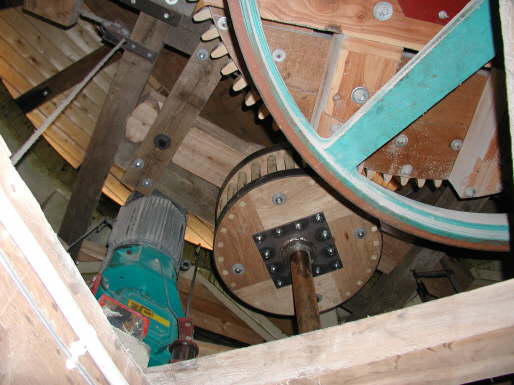 Flügelwelle und Königswelle sind über Kammrad und Bunkler ständig kraft- schlüssig verbunden und das Übersetzungsverhältnis beträgt 1:2, d.h. beide Wellen drehen sich stets gemeinsam, jedoch läuft die Königswelle doppelt so schnell wie die Flügelwelle. - Unterhalb des Stirnrades befindet sich das Antriebsrad für einen 21 KW - Generator zur Stromerzeugung, der neben der Mahlspindel des neuen Mahlganges positioniert ist.