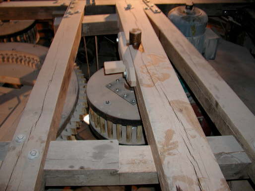 Ein Stillstand des Mahlganges wird erreicht, indem man den Kraftschluss zwischen Stirnrad und Mahlspindel löst. Dies geschieht durch Aus- bzw. Einrücken des schwenkbaren oberen Lagerkalkens der Mahlspindel. Der Lagerbalken wird in den jeweiligen Endpositionen arretiert.