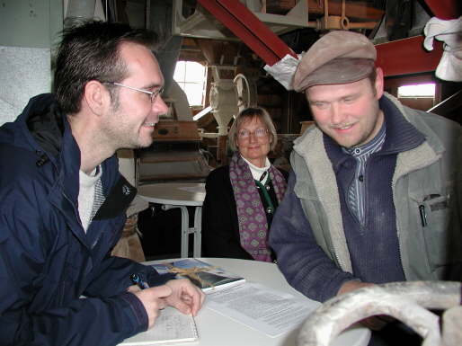“Klappern gehört zum Handwerk” - wo sonst, als in eíner Mühle findet dieser Spruch seine Erfüllung ? - Und so darf denn auch die schreibende Zunft nicht fehlen, um das Ereignis in der Bardowicker Mühle in einen journalistischen Rahmen zu setzen und der Öffentlichkeit darzustellen. Stefan Bohlmann (lks.), Redakteur der “Landeszeitung für die Lüneburger Heide “, ist einer von Eckhard Meyers Jugendfreunden.