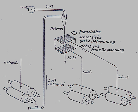Bild 6 - Prinzipskizze zur Durchlaufmühle - Für jedes Zwischenprodukt steht eine individuelle Vermahlungs- und Sichtpassage zur Verfügung