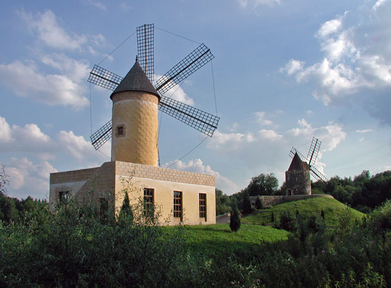 Ein originalgetreuer Nachbau einer spanischen Turmwindmühle von der Insel Mallorca. Die sechsflügelige Mühle steht auf einem rechteckigen Unterbau, der im allgemeinen als Wohnhaus des Müllers diente. Auf dem über eine Wendeltreppe erreichbaren Kappenboden befindet sich ein Steinmahlgang zur Getreidevermahlung. |