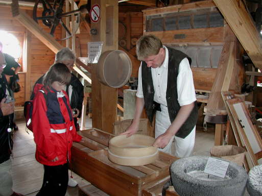Vorführung der Siebtechnik zur Trennung des Mahlgutes aus der Handmühle. Im Hintergrund der neu eingerichtete Askaniasichter.