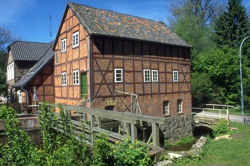 Wassermühle Tangsehl Am Rande des großen Waldgebietes Göhrde liegt der aus nur zwei Höfen bestehende Ort Tangsehl mit seiner Mühle am kleinen Göhrde-Bach. Die 1353 erstmals erwähnte Mühle scheint mit ihrem oberschlächtigen Wasserrad oft unter Wasserknappheit gelitten zu haben, und auch der Mühlenteich hinter dem Haupthaus von 1875 konnte da wohl oft nicht den nötigen Ausgleich schaffen. So errichtete 1870 der damalige Müller unweit des Hofes eine Windmühle, die ein Blitzschlag jedoch gleich nach ihrer Fertigstellung vernichtete. Auch ein zweiter Versuch an der gleichen Stelle scheiterte: Wieder traf ein Blitz die Mühle und äscherte sie ein. So blieb es also bei der Wassermühle, die 1900 ihr heutiges Mühlengebäude erhielt, einen mehrstöckigen Fachwerkbau. Doch wurde dieser Neubau nicht, wie so oft, mit dem Einbau einer Turbine verbunden. Vielmehr arbeitete sie bis zu ihrer gewerblichen Stillegung 1963 nur mit ihrem Wasserrad. An der noch vollständig eingerichteten Mühle dreht sich seit einigen Jahren wieder ein Wasserrad. Und wer die großen Wälder um die Mühle erkunden will, dem bietet der Mühlenhof Fremdenzimmer. In jüngster Zeit hat sich die Tangsehler Mühle einen Ruf als Konzertort im Rahmen des Förderprojektes “Jugend musiziert” erworben. |