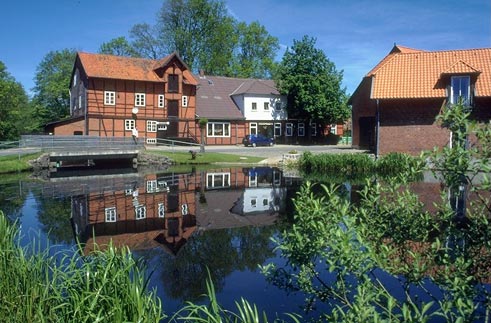 Wassermühle Thomasburg Ein dichter Auwald zieht sich bei Thomasburg entlang der Neetze hin und begrenzt den Ort im Westen. Wo die Straße den sumpfigen Talgrund quert und in einem Bogen zum Burghügel mit seiner Feldsteinkirche führt, liegt zwischen Mühlenteich und Bruchwald die Thomasburger Mühle. Zwischen Burgberg und Mühle entstanden auch die frühesten Siedlungsansätze dieses Ortes und vermutlich ist auch die Mühle bereits im Frühmittelater erstmals angelegt worden. Urkundlich bezeugt ist sie jedoch erst seit 1373, als ein Feuer sie zerstörte. Ursprünglich im Besitz des Klosters Rastede, gehörte sie seit dem 15. Jh. zum Kloster Lüne und wurde nach der Reformation landesherrschaftlich. Im 30jährigen Krieg zerstörten durchziehende Schweden die Mühle, die eine Korn-, Öl-, Bake- und Walkmühle war. Die lange schon baufällige Mühle wurde 1839 neu erbaut. Damals entstand der heutige, zweigeschossige Fachwerkbau mit einem neuen Wohnhaus. 1935 erhielt die Mühle ihre Turbine und arbeitete mit zwei Walzenstühlen bis in die 1970er Jahre hinen. Gegenüber der Mahlmühle liegt das Gebäude der ehemaligen Ölmühle. |