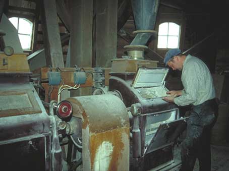 Kaum ein Prinzip zur Nahrungssicherung des Menschen hat sich seit vorgeschichtlicher Zeit über Jahrtausende bis in unsere Gegenwart so unverändert erhalten, wie die Kornvermahlung zwischen zwei Mahlsteinen. Als technisch- wirtschaftliches Produktionsmittel jedoch ist die Zeit des Steinmahlganges zu Ende gegangen. - In der ersten Hälfte des 19.Jahrhundert setzte sich von England und den USA kommend ein völlig neues Mahlprinzip durch. In Deutschland baute im Jahre 1876 der Mühleningenieur Friedrich Wegmann ein Walzenstuhl genanntes Mahlgerät, bei dem das Korn zwischen zwei gegenläufigen Walzen nicht wie bei den Mahlsteinen zerrieben, sondern aufgebrochen und zerschnitten wird. Wegen der geringen Reibung wurde schonender gemahlen, die Mahldauer wurde deutlich verkürzt und damit die tägliche Mahlleistung erheblich gesteigert. Die Wartung konnte wesentlich vereinfacht werden, schon der Entfall des aufwändigen Steineschärfens war eine deutliche Erleichterung der schweren Müllerarbeit. Vorteile ,die den Walzenstuhl seit seiner Einführung bis heute zur ersten Wahl als gewerbliches Produktionsmittel für die Getreidevermahlung werden ließ. Dennoch, der Steinmahlgang ist nicht “aus der Mode” gekommen. Liebevoll gepflegt, erfreut er sich in vielen funktionsfähigen Museumsmühlen, Vereins- und Privatmühlen eines recht lebendigen und von Mühlenbesuchern bestaunten Daseins. Auch in traditionellen, noch gewerblich genutzten Mühlen erfährt der Steinmahlgang eine kleine Renaissance, nicht nur zur Anschauung, sondern auch zur Wiedernutzung. Eckhard Meyer, Müllermeister und Besitzer der Bardowicker Windmühle (s.obiges Foto) will in 2003 einen zweiten windgetriebenen Steinmahlgang in seiner Mühle einrichten, um damit Backschrot zu mahlen, nachdem er bereits 1998 einen Steinmahlgang mit Windantrieb zur Futterschrotherstellung in Betrieb nahm. Nach betriebswirtschaftlichen Erwägungen “rechnet sich” solches Bemühen nicht, es findet seine Motivation in der idealistischen Einstellung eines jungen Müllers, der sich der Tradition seines Berufes und der Erhaltung eines Kulturgutes verplichtet fühlt. - Der örtliche Windmühlenverein unterstützt diese Haltung nach besten Kräften.