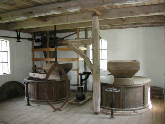 Zwei funktionsfähige Steinmahlgänge befinden sich auf dem Mahlboden der Mühle, dazwischen steht ein Steingalgen zum Aus- und Einbau der Mahlsteine. An der linken Wand ist eine Transmission zum Antrieb weiterer landwirtschaft- licher Geräte erkennbar.