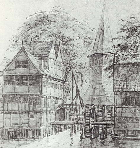 An diesem Standort an der Bille war Jahrhunderte lang eine 1208 angelegte Kornwassermühle in Betrieb. Waterloos Zeichnung zeigt deren Nachfolgerin. Die drei mächtigen, gestaffelt angeordneten unterschlächtigen Wasserräder der Mühle belegen anschaulich die Bedeutung eines größeren Mühlenbetriebes. Das Mühlengebäude in Fachwerk wurde im 19. Jhdt. in seiner baulichen Form verändert und in den auf Waterloos Zeichnung dargestellten Freiraum zwischen den beiden Häusern hinein verlängert, so dass heute der Blick auf den Turm nur noch erheblich eingeschränkt möglich ist. Das Gebäude wird heute nicht mehr als Wassermühle genutzt.