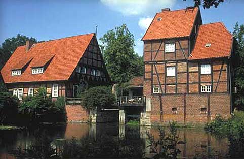 Bereits 1351 ist in Wienhausen eine Mühle urkundlich erwähnt. Bis zur Reformation gehörte sie zum naheliegenden Kloster, danach kam sie an die Landesherrschaft. 1591 veranlasst der Celler Herzog Wilhelm der Jüngere, dass die baufällige Mühle neu errichtet wird. Es ist das eingeschossige kunstvoll verzierte Fachwerkgebäude am rechten Ufer des Mühlenkanals. Ein unterschlächtiges Wasserrad der Roggenmühle trieb mindestens drei Mühlsteine aus Kalksandstein an. - Ende des 18.Jahrhunderts entstand am linken Ufer des Mühlenkanals die neue mehrstöckige Getreidemühle. Die alte Mühle wurde 1837 nach vorangegangener Petition an den König restauriert und diente fortan als Sägemühle, Lagerhalle und Wohnraum. 1902 erwarb die Staugenossenschaft Offensen- Schwachhausen beide Mühlen. 1906 erhielt die Getreidemühle eine Turbine und 1908 wurden das Wasserrad sowie die Kreissäge der alten Mühle stillgelegt und eine Turbine eingebaut. Verbunden mit einem Dynamo und ab 1913 ergänzt mit einem 40-PS-Dieselgenerator versorgte sie als kleines Elektrizitätswerk Wienhausen bis 1956 mit Strom. Seit 1968 ist die alte Mühle das Rathaus der Gemeinde Wienhausen und der Samtgemeinde Flotwedel. In der jüngeren Mühle wurde bis 1962 Getreide gemahlen. 1973 kam sie in Privatbesitz, wurde renoviert und dient seitdem als Wohnsitz, Werkstatt und Atelier. Seit 1982 erzeugt eine Turbine Strom. |