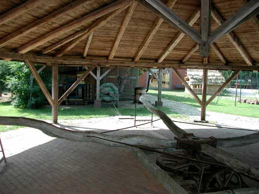 Pferdegöpel mit gußeisernem Getriebe unter dem sog. „Göpelschauer" - einem Holzdach als Wetterschutz - auf dem Gelände des Freilichtmuseum.
