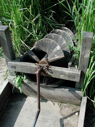 Archimedische Schraube (Wasserschnecke) in einem hölzernen Rohr (Köcher) - hier ist das Rohr zur Demonstration des Wassertransportes halbiert und die Wasserschnecke mit einer Handkurbel versehen - im Betriebszustand ist die Schnecke direkt mit der Flügelwelle verbunden und der Köcher geschlossen.