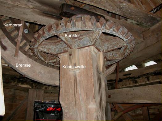 Das „Herz" einer Windmühle: Kammrad, Bunkler und Königswelle in der Drehkappe der Artlenburger Mühle.